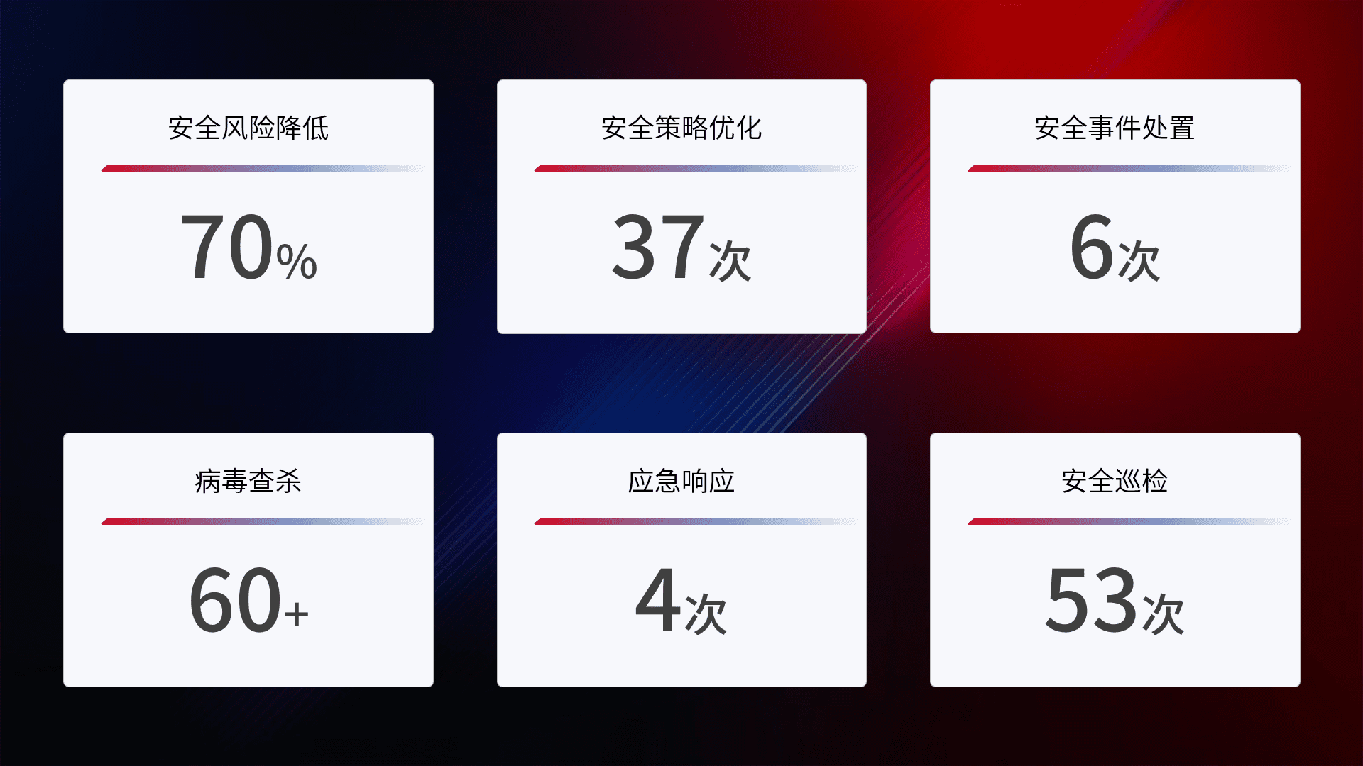 提供全面的安全事件报告体系,,,,包括处置报告、、、、周报、、、季度和年度总结,,,结合持续监控,,,,帮助客户深入了解网络安全状况。。。